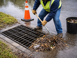 - Clearing debris from floor drains, storm drains, and gutters so water flows away as designed
